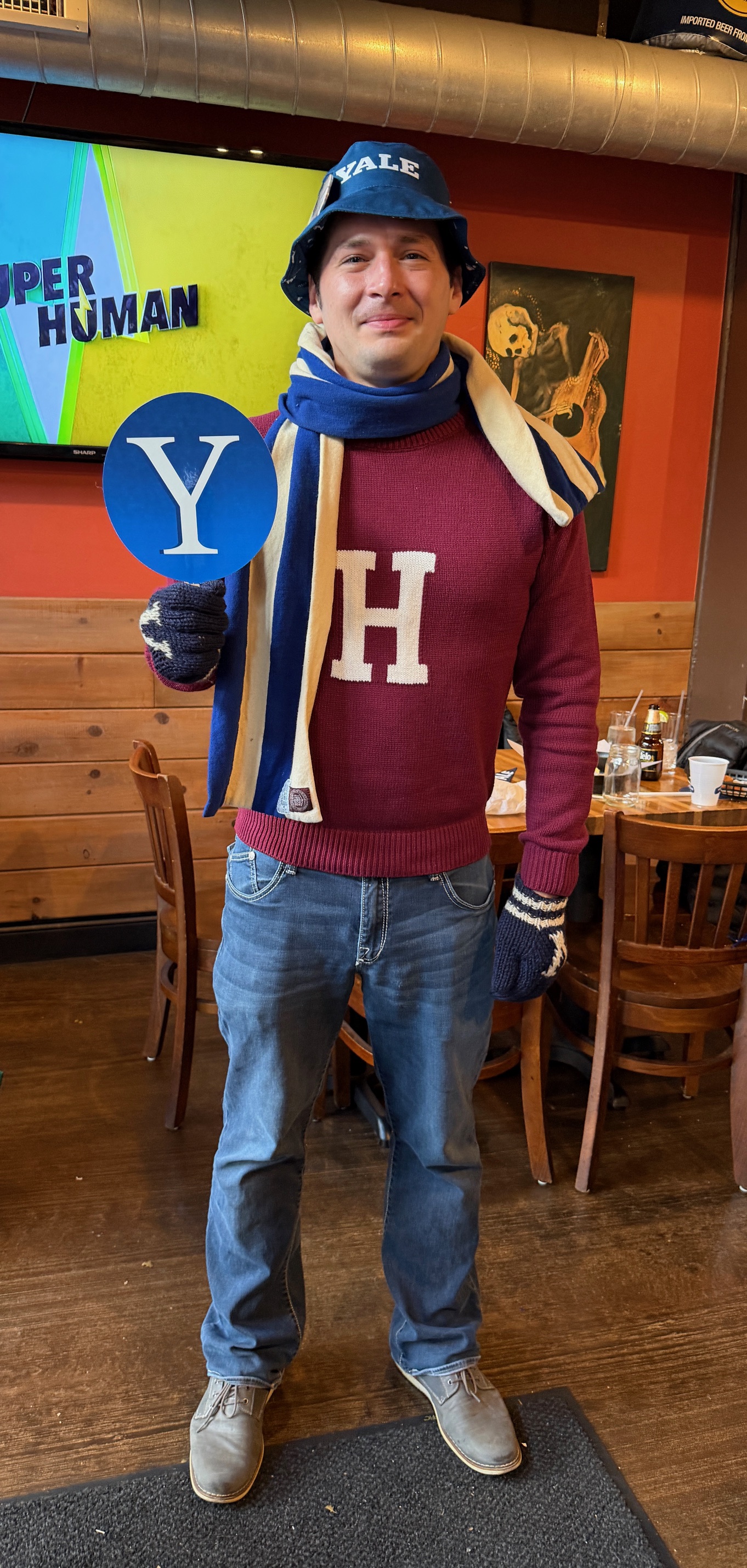 Our president Brandon Mordue gamely donned Bulldog Blue and posed at the watch party. According to the contest terms, we post a photo here.